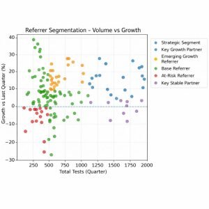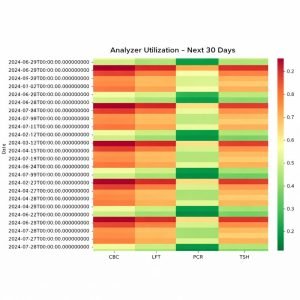 This heatmap shows day-wise analyzer utilization across key diagnostic tests,helping healthcare providers anticipate capacity constraints and optimize labscheduling.