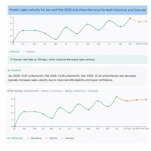 This chart lets users predict future sales velocity and instantly simulate what-if scenarios—such as interest rate changes—on the fly, all in one unified view.